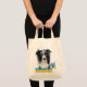 Une belle façon pour les amoureux des animaux de montrer leur soutien à l'Ukraine. Joli sac fourre-tout présente l'aquarelle Border Collie chien avec le texte "Ukraine" et papillon dans les couleurs bleu et jaune de leur drapeau national sur l'arrière - plan jaune.