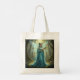 Une belle fée habillée d'une robe turquoise coulante et d'un collier de pierres turquoise, turquoise et sainte dans ses longs cheveux turquoise et ses ailes irisées en forme de libellule tenant une branche sainte se dresse dans une forêt magique entourée d'herbes, de rochers et d'arbres couverts de vignes.