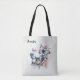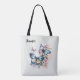 Sac fourre-tout avec un trio de papillons flottant parmi de jolies fleurs. Couleurs bleu rose et vert.