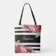 Ce sac fourre-tout présente une aquarelle moderne bordeaux et des fleurs rousses avec feuillage sur un arrière - plan rayé avec de l'or faux rose. Personnalisez-le avec un nom ou vos initiales.