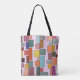 Ce sac fourre-tout a un design moderne boho de rectangles attachés à des lignes verticales de différentes tailles et des couleurs rétro.