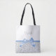 Sac fourre-tout empreinte de léopard gris et blanc tendance agrémenté d'une photo d'un arc en satin bleu doux. Personnalisez en ajoutant le nom de votre fille préférée. Image imprimée plate, NON apposée avec un ruban réel.