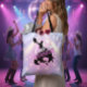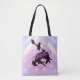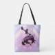 Sac fourre-tout humoristique de disco pour l'enterrement de vie de jeune fille, conçu pour l'équipe de la mariée. Dans de belles couleurs dégradées allant du lavande au bleu-pétales et au rose avec une boule disco funky, silhouette de cow-boy maîtrisant un bronco, police rétro glamour « Bride 'em Cowboy » (l'équivalent country de « mets-lui la bague ») et fond de lumières disco. Recherchez ID928 pour voir d'autres produits de cette collection tendance.