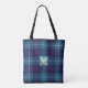 Sac fourre-tout tendance en cuir à carreaux bleus tartan monogrammé personnalisable avec nom et initiales sur une plaque de cuir et fond à carreaux bleu céladon et bleu foncé.