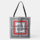 Sac fourre-tout imprimé dans un motif moderne rétro de carrés intervertissants, en gris graphite / gris, rouge profond et blanc, sur un arrière - plan gris moyen