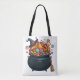 Cauldron Du Sac fourre-tout Giggle & Gummies. Des poutres joyeux en chaudron, farcies de bonbons qui explosent comme des confettis, arborant fièrement un casquette sorcier. Son pote à balai se penche de près, attendant clairement le décollage à sucré, la plus belle sorcière d’Halloween !