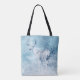 Un sac fourre-tout avec l'image d'un cerf majestueux en hiver. Un arrière - plan filtré bleu glacé donne à cette photo un air froid d'hiver avec une sensation magique. Cet animal noble et fier se dresse au loin sur une colline avec des pins d'hiver.
