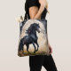 En Face D'Une Pleine lune Dans Un Champ Fleuri, On Voit Un Cheval Noir S'Élevant.