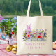 Ajoutez un nom d'enfant à cette jolie chasse aux oeufs de Pâques Cute lapin rose fleur sauvage Hoppy sac fourre-tout de Pâques. Cette adorable illustration montre un lapin lapin de Pâques assis dans une prairie fleur sauvage entourée de magnifiques fleurs de printemps d'aquarelle, y compris la fleur de maïs, la marguerite et le pavot. Script de typographie d'écriture manuscrite rose. Un sac idéal pour une chasse aux oeufs de Pâques ou pour des cadeaux de Pâques. OEuvre originale de l'artiste Catherine Sweetman