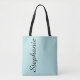 Le sac fourre-tout personnalisé bleu et noir aux oeufs de ce merle à la mode comporte votre choix d'arrière - plan de couleur et le nom est typographie moderne enorme. Le nom est seulement d'un côté au cas où l'intimité serait désirée. Un cadeau élégant pour des membres de votre partie nuptiale. Tous droits réservés © Alan 2019 et Marcia Socolik.