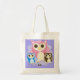 Ce sac fourre-tout personnalisé présente une grande chouette rose, une petite chouette bleue et une petite chouette brune contre un arrière - plan mauve.