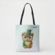 Sac fourre-tout avec une merveilleuse illustration fantaisiste. Un grand hibou brun aux yeux portant un chapeau vert et une cravate d'arc.
