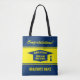 Classe de jour de fin d'études secondaires de 2024 Sac fourre-tout personnalisé. Une idée cadeau personnalisée pour les diplômés, les diplômés de l'enseignement supérieur et les étudiants de l'université. Logo moderne casquette de goût avec date et nom. Exemple de modèle bleu et jaune. Impression double côté.