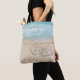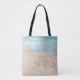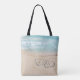 Sac fourre-tout de plage tropical moderne avec sable, mer, et deux coeurs dans le sable avec vos initiales.