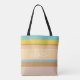Sac fourre-tout de plage élégant imprimé à l'avant et à l'arrière avec des rayures représentant les couleurs de la plage, du sable, du soleil et du ciel en beige, tan, bleu et jaune