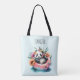 Sac fourre-tout avec une adorable image estivale. Une aquarelle avec un panda noir et blanc assis dans une bague de baignade dans l'eau. Entouré de jolis fleurs sauvages. Un ours totalement froid.