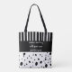Créez un sac fourre-tout de devis personnalisé ajoutez votre propre devis sur des points noirs et blancs en gras et des motifs rayés dans un style chic moderne sur toute l'impression.