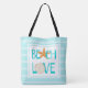 Grand sac fourre-tout à amusement pour toutes vos bases de fuite pour un voyage à la plage ! L'aqua pâle fourre-tout avec les filets blancs, et les mots ÉCHOUENT L'AMOUR défini avec une peu d'aide d'une étoile de mer et d'un dollar de sable.