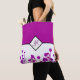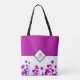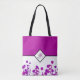 ** Elegance Blooms : Monogramme personnalisé Fourre-tout ** Tourner la tête avec ce sac fourre-tout étonnant, un mélange captivant de glamour et de chic moderne. Conçu dans un rose violet moyen luxueux, le sac présente un détail sophistiqué de ligne noire qui se termine par un diamant chic au centre. Vos initiales monographiques personnalisées, magnifiquement entrelacées dans un script et une combinaison de polices serif, occupent le devant de la scène, ajoutant une touche d'élégance unique. La moitié supérieure du sac est une étendue captivante d'un rose violet moyen riche, tandis que la moitié inférieure présente une délicieuse danse florale dans les tons roses contre un arrière - plan blanc croustillant. Un accessoire indispensable pour refléter votre style exquis.