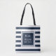 Élégant sac monogramme d'initiales personnalisées tendance avec un motif rayé bleu marine avec vos initiales et votre nom de famille avec votre date établie dans un carré bordé bleu marine avec un texte blanc classique. Conçu par Thisisnotme©