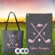 Looking for a stylish personalized golf tote bag for women that doesn’t get lost or look boring? This chic tote bag features bright pink golf clubs with white bows, a matching golf hat, and a crisp white golf ball on an elegant gray background. Customize it with initials and a full name for a polished, personal touch.
