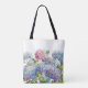 Ce sac fourre-tout élégant à demoiselle d'honneur comporte les fleurs magnifiques d'hortensia de bleu et de lavande. Au dessus est un nom et un titre de demoiselle d'honneur qui peut être personnalisé. Conçu par le ©Tim de renommée mondiale Coffey d'artiste.
