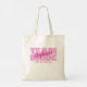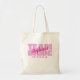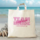Le design personnalisé de sac cabas pour votre enterrement de vie de jeune fille présente "ÉQUIPE MARiée" en caractères gras rose clair. Personnalisez le nom de la demoiselle d'honneur avec une écriture rose foncé brillant coordonnée. Le titre ou le texte personnalisé est présenté ci-dessous. Toutes les couleurs de ce design sont personnalisables dans l'outil de conception Zazzle ! Le design se répète au dos.