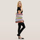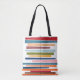 Ce sac fourre-tout a une conception moderne du milieu du siècle de lignes horizontales de couleur sur une ligne verticale noire avec des cercles.m