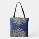 Elégant Sac fourre-tout bleu marine avec un design de fleur Mandala en faux or complexe représentant la floraison de la pureté dans notre âme. Le bleu représente à la fois le ciel et la mer et est associé aux espaces ouverts, ainsi qu'à la loyauté, à la sagesse et à la confiance. Parfait pour une belle cérémonie d'été heureux. Vous pouvez modifier le texte à partir du menu Personnaliser pour la servante d'accueil, la mariée, la mère de l'épouse et l'accueil. Design original par SunFreeStar.