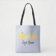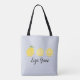 Le sac fourre-tout de cette fille lumineuse et colorée présente un trio aquarelle de citrons sur un arrière - plan à rayures bleu clair. Personnalisé avec le nom de votre enfant. Fonctionne le mieux sur les options d'impression blanches ou vives