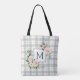 Ce sac fourre-tout à monogramme présente des fleurs aquarelles peintes en rose saumon, blanc et feuillage vert sur un fond à carreaux aquarelle pastel. Pour une personnalisation plus avancée de ce design, veuillez cliquer sur le bouton "Personnaliser". Des articles assortis sont également disponibles.
