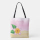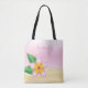Ce sac fourre-tout présente l'illustration de Destei d'une fleur de plumeria frangipani de couleur rose et orange avec des feuilles verts. La couleur arrière - plan est rose avec une texture de sable au fond. Il y a aussi une zone de texte personnalisable pour un nom.