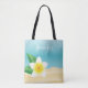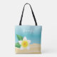 Ce sac fourre-tout présente l'illustration de Destei d'une fleur de plumeria frangipani de couleur blanche et jaune avec des feuilles verts. La couleur arrière - plan est bleue avec une texture de sable au fond. Il y a aussi une zone de texte personnalisable pour un nom.