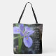 Joli fourre-tout floral avec verset de l'écriture; belle iris d'eau violette, avec Luc 1:45 écrit sur le côté de la fleur. Béni soit celle qui a cru que le Seigneur allait remplir ses promesses envers elle ! Le sac fourre-tout avec tout imprimé est disponible en deux tailles.