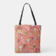 Joli sac fourre-tout de design floral Whimsical avec tulipes, vignes et coeurs en différentes couleurs sur un arrière - plan de corail rose. Il y a une zone que vous pouvez facilement customiser avec votre nom!
