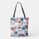 Le sac fourre-tout est orné d'étoiles patriotiques, de coeurs et de confettis aux couleurs du drapeau américain dans une ambiance rétro vintage. Les mots Liberté, Foi et Liberté sont éparpillés au hasard dans la conception.