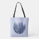 Ce Sac fourre-tout dispose d'une forêt d'hiver enneigée. Des sapins neigeux dans les tons bleus sur un arrière - plan délicat. Photo originale. Un cadeau de Noël romantique. Texte personnalisé.