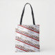 A funny dog choir on an all-over print tote shopping bag. Use "Personalize this template" to change the "Howl-lelujah! text, and create a unique, personalized message. Featuring a striped pattern of six toy dog breeds singing in a doggy choir, including a Dachshund, Yorkie, Bichon Frise, Chihuahua, Pomeranian and a Pug. Each doggy choirboy is wearing traditional red and white robes and holding a hymn book and candle.