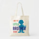 Sac fourre-tout fait sur commande à garçons de silhouette de super héros de petit frère. Le lettrage orange, vert, bleu et rouge me définit "suis le petit frère" avec un nom dessous. Personnalisez ce sac fourre-tout pour un cadeau pour un petit frère. Silhouette bleue de garçon de super héros avec le cap, les bottes, et les mains sur des hanches. Cadeau d'amusement pour un petit frère. Coordonnée avec une conception de frère. www.SamAnnDesigns.com
