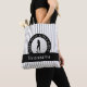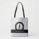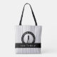 Sac cabas personnalisé élégant avec une silhouette de golfeuse placée sur une image réaliste de balle de golf, encadrée par le texte incurvé « GOLF GOLF GOLF GOLF » en blanc net. Un bandeau noir porte votre nom personnalisé ou une courte phrase en écriture blanche élégante. Le fond présente un motif à rayures verticales tendance dans des tons gris et blanc ultimes. Les deux côtés sont personnalisables - ajoutez un nom d'un côté et une phrase comme « Live to Golf » de l'autre. Fait un cadeau élégant pour les amateurs de golf, les athlètes ou les participants à des tournois. Les couleurs et les polices sont modifiables dans l'outil de conception. Envoyez un message à BeachPauseDesigns pour des questions ou des demandes personnalisées.