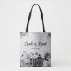 Sac fourre-tout "Trick or Treat" d'Halloween. Noir et blanc, il ressemble à un vieux dessin d'Halloween avec un décor éffrayant avec des citrouilles, des chauves-souris, des sorcières volantes, un chat noir et une maison hantée. Il peut être facilement personnalisé avec le nom ou le message que vous voulez.