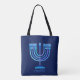 Symbole de Hanukkiah. Joyeux Hanoukka Party Juif Holiday Blue Menorah. Décoration Chanukkah de Fête Juive avec le symbole décoratif traditionnel Chanuka - bleu marine hanukkiah menorah, chandelier avec bougies, étoile de David et néon bleu lumières illustration. Hanoukka Festival des lumières Décoration de l'événement. Jérusalem, Israël. Accessoires > Sacs et portefeuilles > Boutiques et sacs d'achats > Sacs fourre-tout Judaïque Design moderne avec modèle texte. Personnalisez-les en ajoutant un nom ou un texte de voeux. Design à deux côtés.