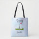 Un sac fourre-tout avec un dessin lunatique de la Tour Eiffel en arrière - plan entouré d'arbres verts. Un coeur rose et la typographie parisienne ajoutent une touche de girly. L'arrière - plan est une aquarelle bleu clair. Personnalisez avec un nom dans une police manuscrite fantaisie.