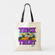 Ce sac d'Halloween clair et coloré Trick ou Treat comprend un groupe de cinq Jack o'Lanterns. Certaines sont orange et d'autres sont noires. En haut et en bas, il y a un grand texte violet qui dit "TRICK ou TREAT". Le dos du sac a la même image avec un champ de texte personnalisé pour un nom en bas à droite.
