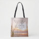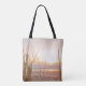 Un sac fourre-tout d'écriture inspiré représente une photographie de la nature avec des roseaux sur la plage et un beau coucher de soleil sur l'océan. Il contient une partie de la Bible Verse Jean 16:13, "Quand viendra l'ESPRIT de VÉRITÉ, IL VOUS GUIDERA DANS TOUTE LA VÉRITÉ... et il vous annoncera les choses à venir."