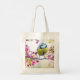 Un sac fourre-tout avec une photo extraordinaire du plus mignon petit oiseau perché sur une branche recouverte de fleurs roses et de feuilles verts. L'oiseau a une tête bleue et un corps jaune avec un visage très doux. Adorable.