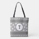 Pois mignon motif grise sac fourre-tout monogramme Comprend un motif de pois blancs contre un arrière - plan gris et des accents croisés.