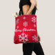 Design texturé rouge avec des flocons blancs et des flocons blancs Noël partout sur le sac fourre-tout d'impression. Le design comporte un arrière - plan de texture rouge avec des flocons de neige et le texte "Joyeux Noël".