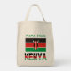Sac fourre-tout montrant le drapeau kenyan avec le mot KENYA ci-dessous dans les couleurs du drapeau. Ci-dessus, ajoutez votre nom, en lettres vertes, pour une touche personnalisée ou un cadeau. Le design se présente de part et d'autre du sac. Super plaisir pour fourre-tout à une réunion de famille.