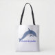 El elemento central es un delfín estilizado representado con un patrón que recuerda al arte, está saltando o nadando sobre un conjunto de olas vibrantes. Los colores predominantes son el azul turquesa, el azul marino oscuro y toques de blanco o un color de contraste, que destacan sobre el tela de otro color a crema, lino o blanco roto del bolso.